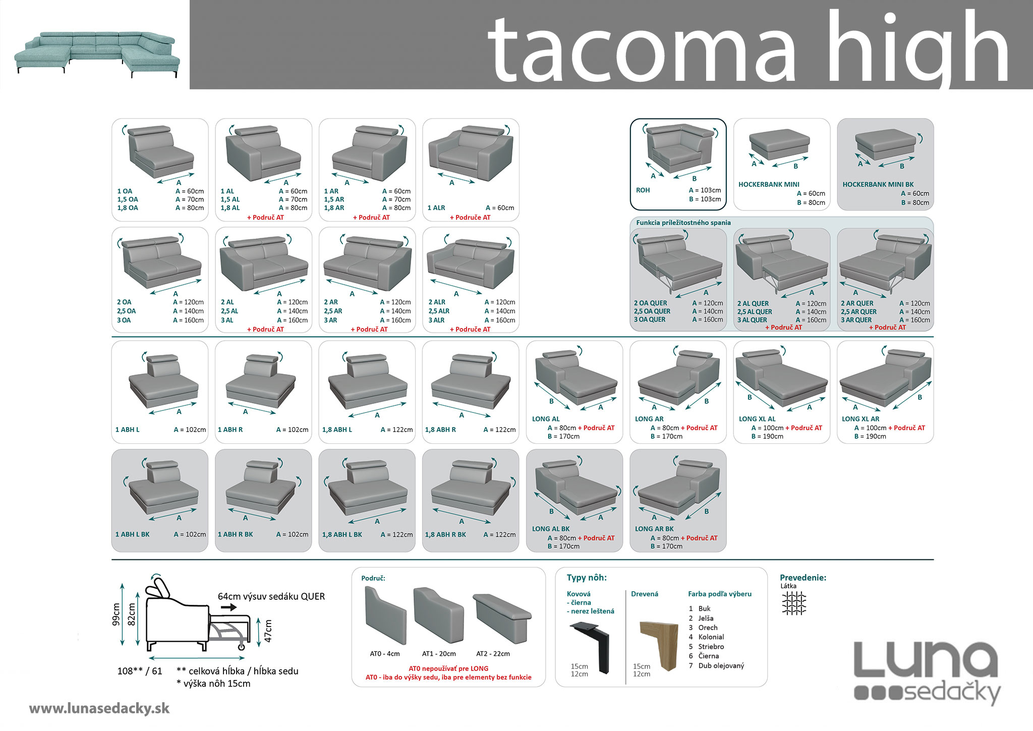 Model TACOMA HIGH vyrábame v rôznych prevedeniach: 2sed, 3sed, sedačka do tvaru L s ležadlom, rohová sedačka, sedačka do tvaru U, taburet.