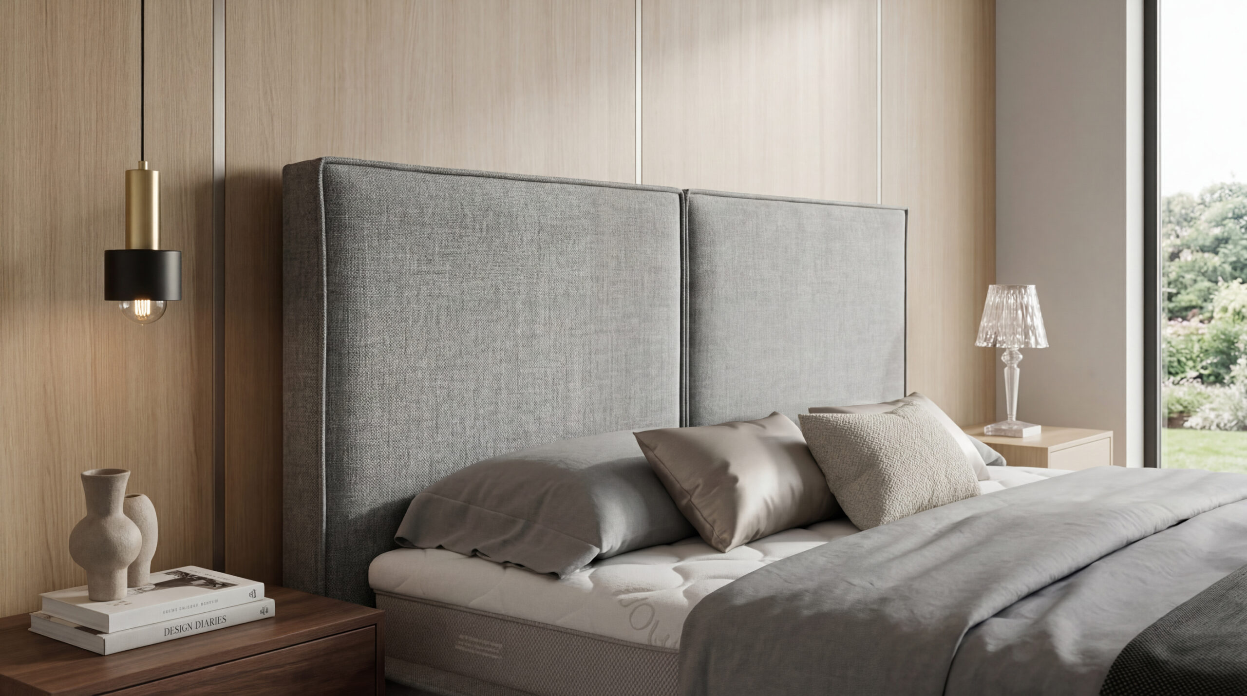 Pohodlné čelo: Vysoké čalúnené čelo rozdelené dizajnovým prešitím chráni stenu a poskytuje oporu.