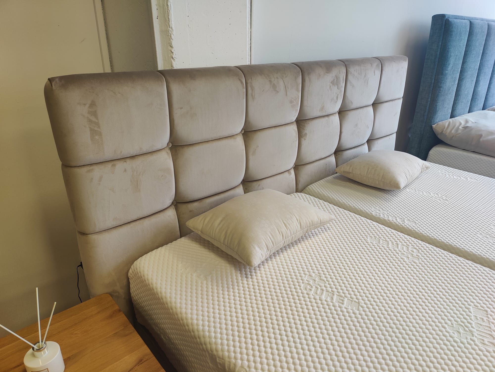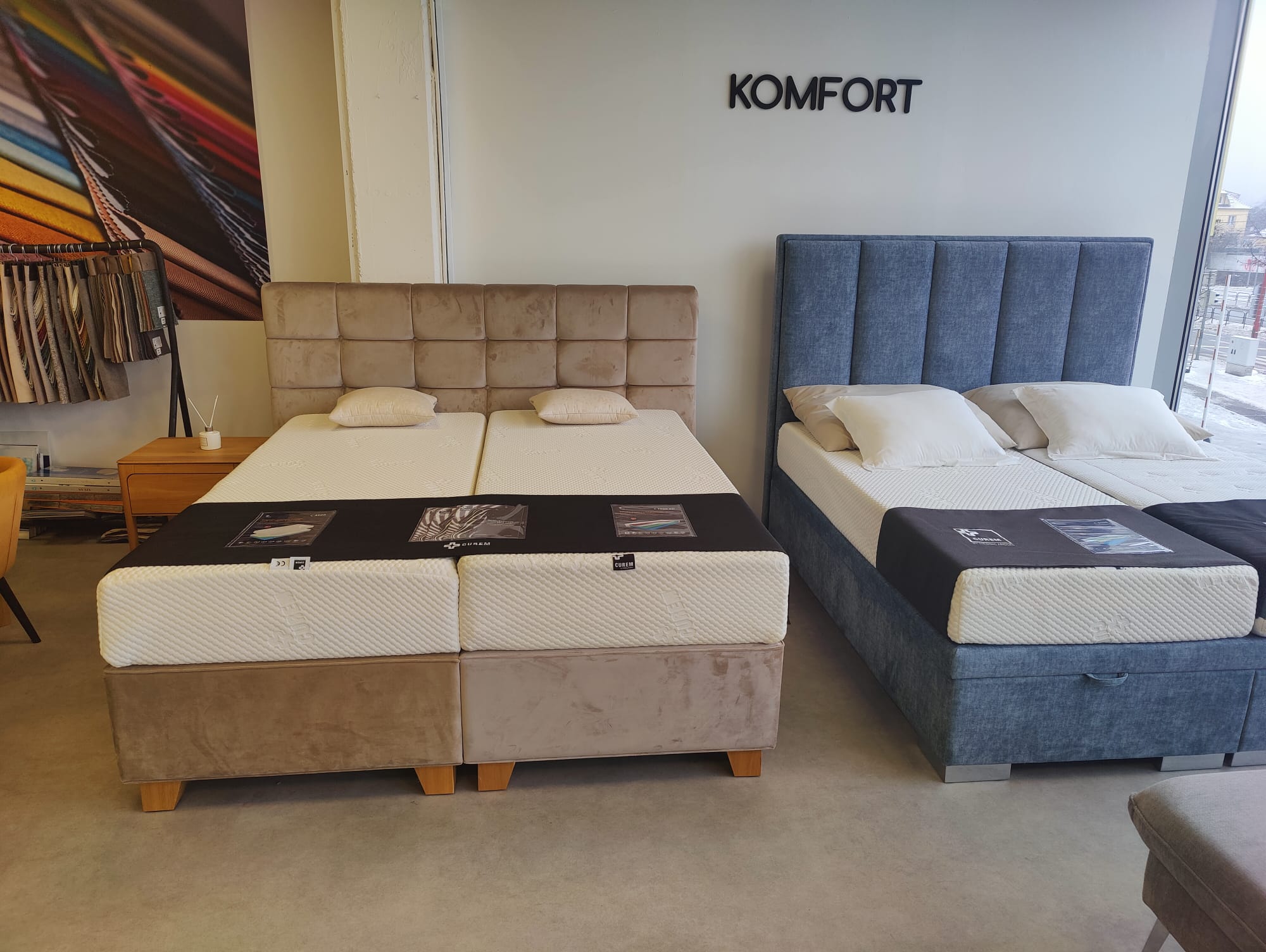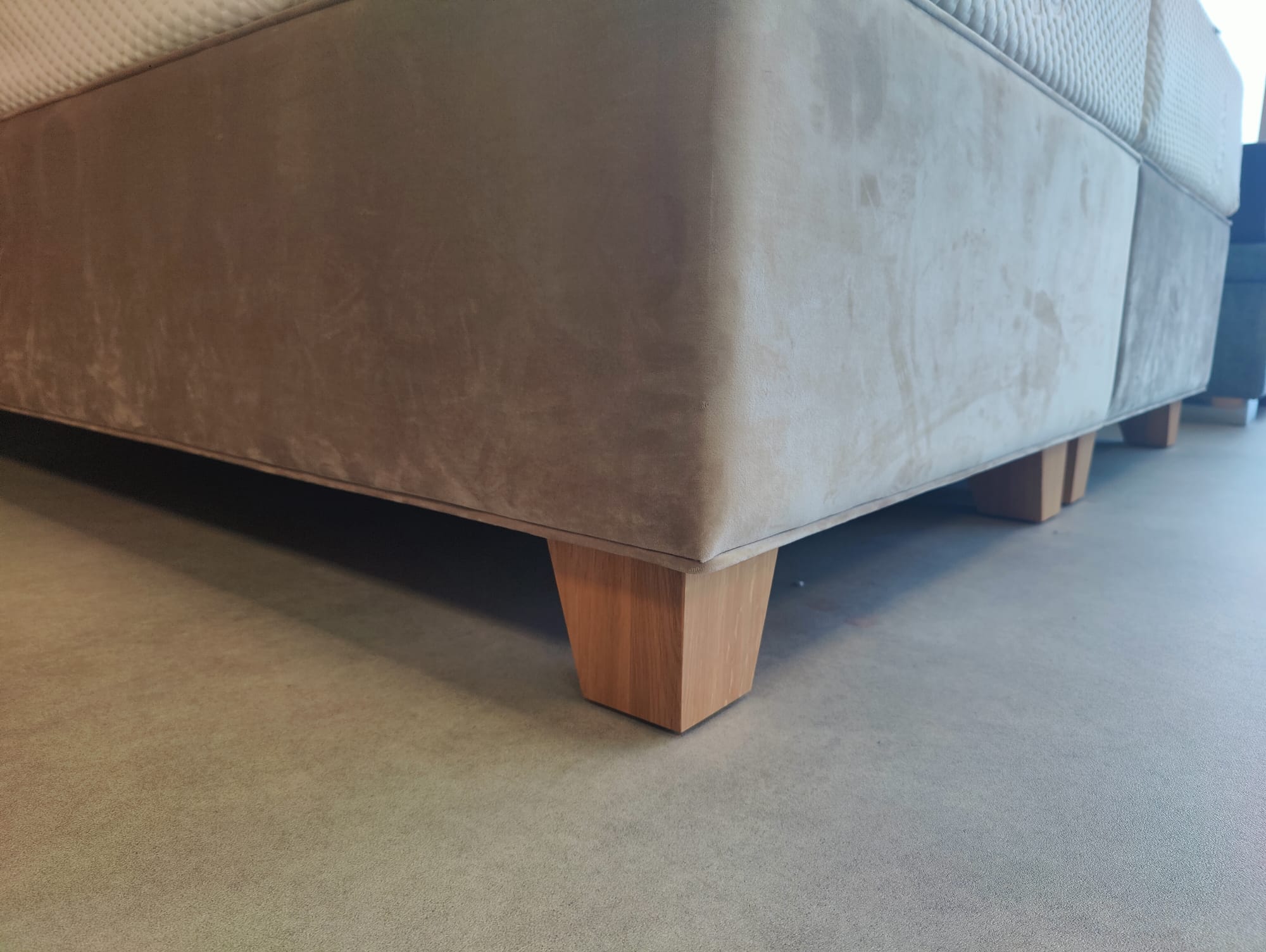 Komfortná posteľ hotelového typu BED-BOX. Spodný čalúnený rám tvorí konštrukcia z pevných lamiel a masívne drevené nožičky.