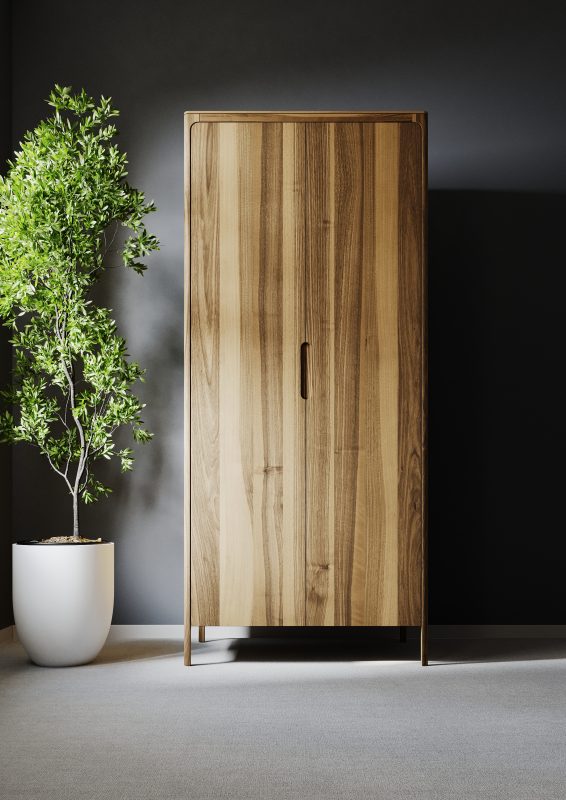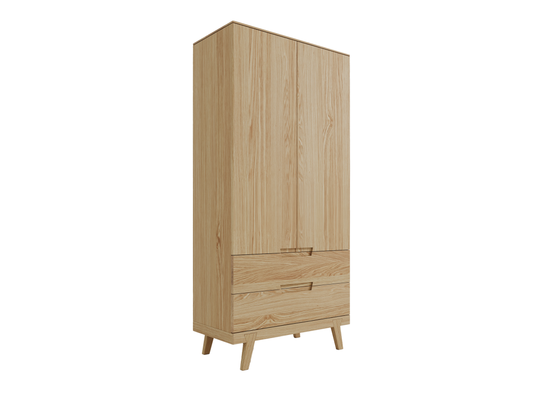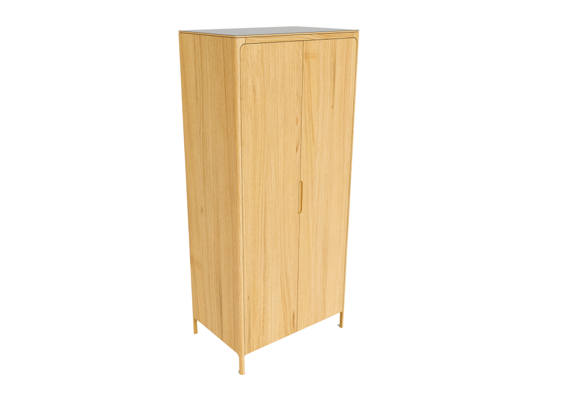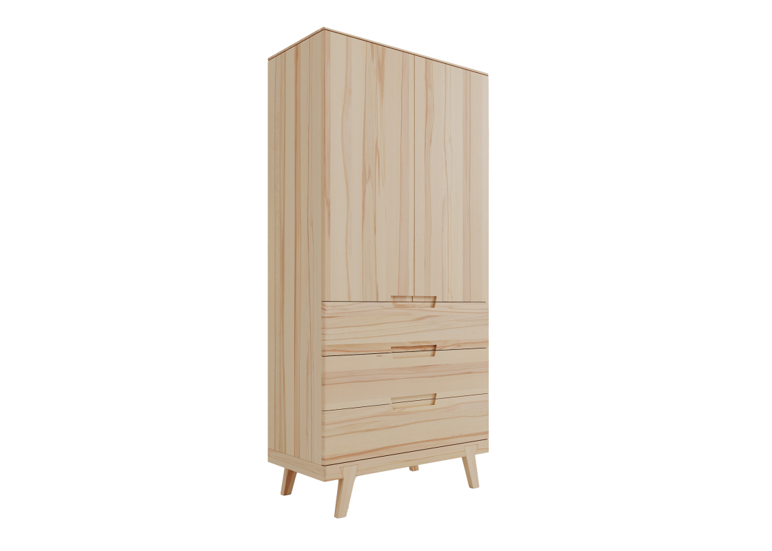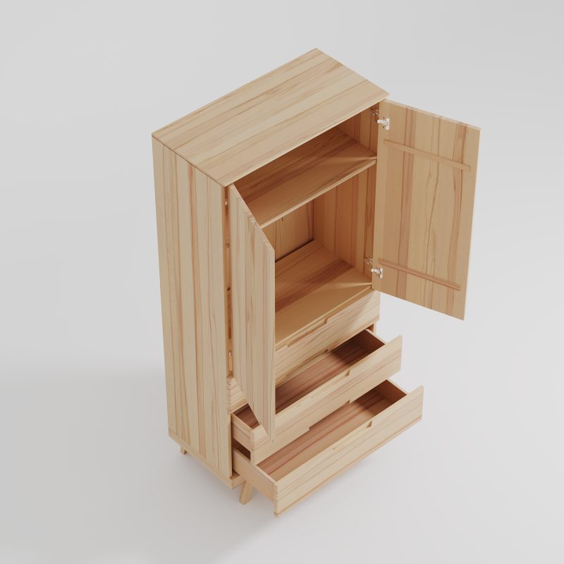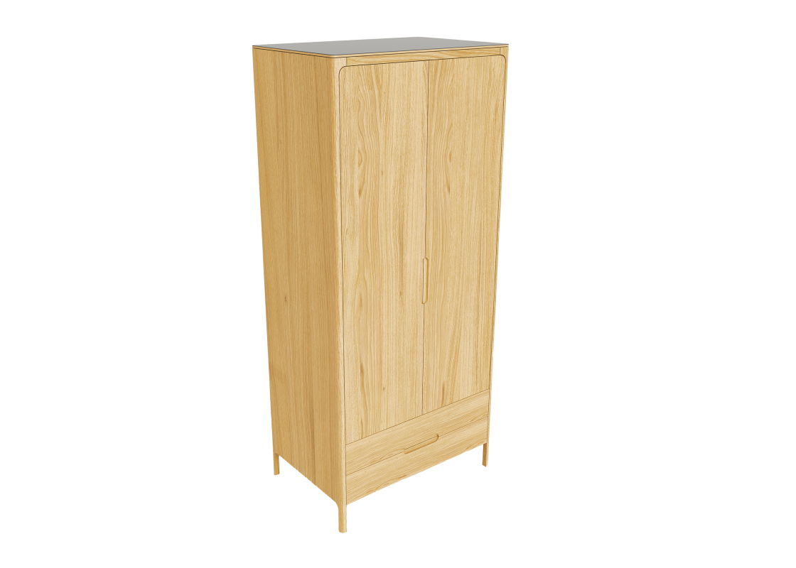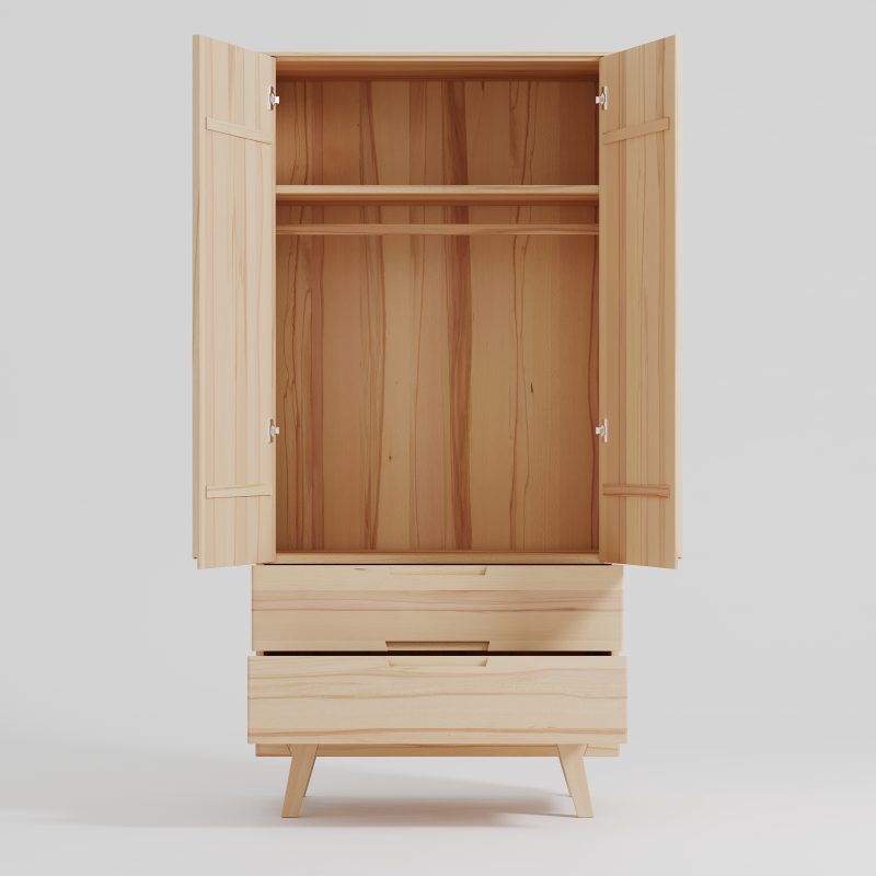 Vnútorné usporiadanie ponúka praktickú vešiakovú tyč na oblečenie, hornú policu na doplnky a možnosť voľby spodnej časti – s policami alebo so zásuvkami. Toto variabilné riešenie umožňuje prispôsobenie úložného priestoru vašim potrebám.