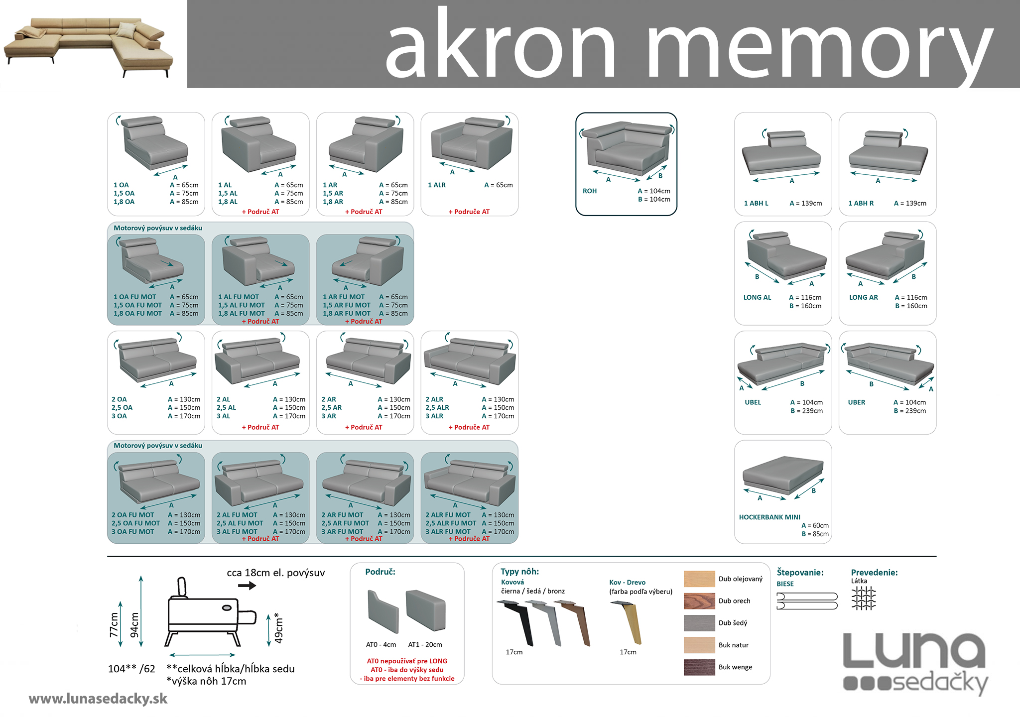 Model AKRON vyrábame v prevedeniach: 2sed, 3sed, sedačka do tvaru L s ležadlom, rohová sedačka, sedačka do tvaru U, taburet.